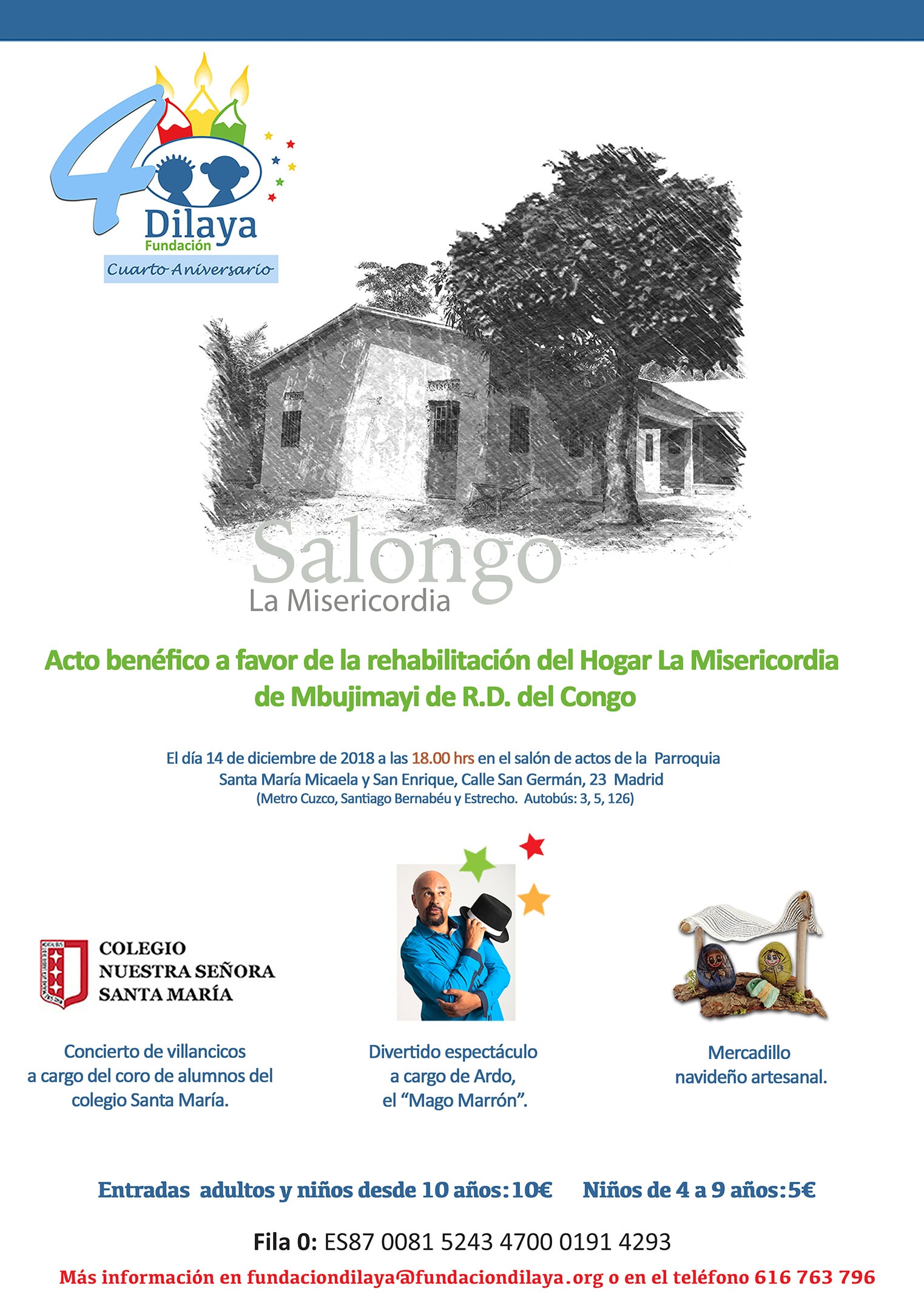 Os invitamos a festejar con nosotros el próximo 14 de diciembre la celebración de nuestro cuarto aniversario. En esta ocasión tenemos un segundo motivo que justifica una celebración en toda regla, la inauguración del nuevo módulo de La Misericordia en Salongo. Juntos disfrutaremos de los logros alcanzados sin olvidar las metas para el 2019.