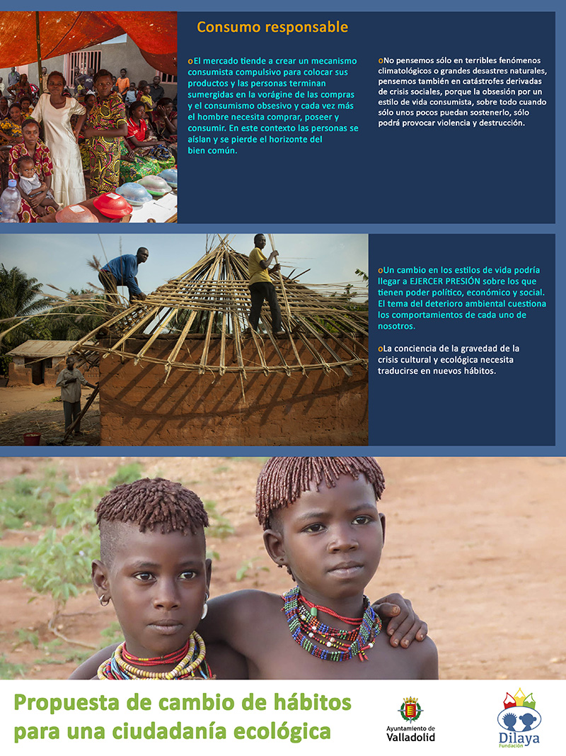 La Fundación Dilaya cuenta con una exposición titulada «Consumo responsable por una ciudadanía ecológica», compuesta de 7 roll ups desplegables de 1 x 2 metros. Si trabajas en un centro educativo y quieres concienciar a tu alumnado sobre esta temática haz tu solicitud escribiendo al correo electrónico cooperacion@fundaciondilaya.org